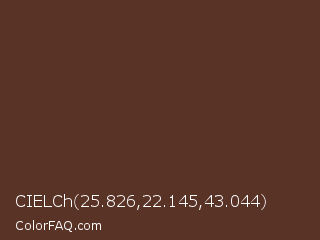 CIELCh 25.826,22.145,43.044 Color is a dark red color and the nearest color is Irish Coffee #5f3d26. Hex code #5a3327 and RGB value is rgb(90,51,39). In RGB color space, this color is composed of 35% red, 20% green, 15% blue, In CMYK color space, this color is composed of 0% cyan, 43% magenta, 57% yellow , 65% black , In HSL color space, this color has a hue angle of 14° , 40% saturation and 25% lightness.