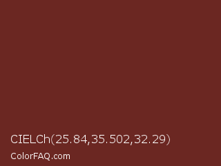 CIELCh 25.84,35.502,32.29 Color is a dark red color and the nearest color is Liver Organ #6c2e1f. Hex code #6b2722 and RGB value is rgb(107,39,34). In RGB color space, this color is composed of 42% red, 15% green, 13% blue, In CMYK color space, this color is composed of 0% cyan, 64% magenta, 68% yellow , 58% black , In HSL color space, this color has a hue angle of 4° , 52% saturation and 28% lightness.