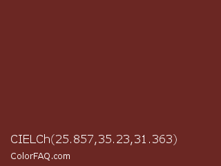 CIELCh 25.857,35.23,31.363 Color is a dark red color and the nearest color is Liver Organ #6c2e1f. Hex code #6b2723 and RGB value is rgb(107,39,35). In RGB color space, this color is composed of 42% red, 15% green, 14% blue, In CMYK color space, this color is composed of 0% cyan, 64% magenta, 67% yellow , 58% black , In HSL color space, this color has a hue angle of 3° , 51% saturation and 28% lightness.