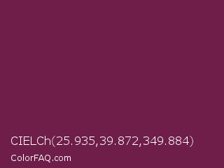 CIELCh 25.935,39.872,349.884 Color is a dark rose color and the nearest color is Tawny Port #692545. Hex code #6e1e49 and RGB value is rgb(110,30,73). In RGB color space, this color is composed of 43% red, 12% green, 29% blue, In CMYK color space, this color is composed of 0% cyan, 73% magenta, 34% yellow , 57% black , In HSL color space, this color has a hue angle of 328° , 57% saturation and 27% lightness.