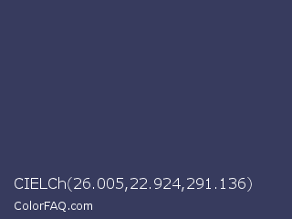 CIELCh 26.005,22.924,291.136 Color is a dark blue color and the nearest color is Rhino #2e3f62. Hex code #373b5e and RGB value is rgb(55,59,94). In RGB color space, this color is composed of 22% red, 23% green, 37% blue, In CMYK color space, this color is composed of 41% cyan, 37% magenta, 0% yellow , 63% black , In HSL color space, this color has a hue angle of 234° , 26% saturation and 29% lightness.