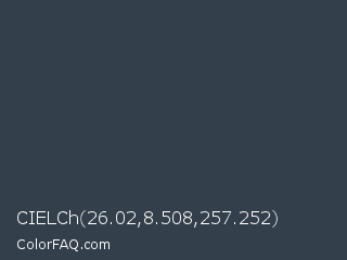 CIELCh 26.02,8.508,257.252 Color is a dark blue color and the nearest color is Charcoal #36454f. Hex code #333f4a and RGB value is rgb(51,63,74). In RGB color space, this color is composed of 20% red, 25% green, 29% blue, In CMYK color space, this color is composed of 31% cyan, 15% magenta, 0% yellow , 71% black , In HSL color space, this color has a hue angle of 209° , 18% saturation and 25% lightness.