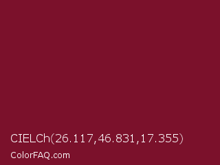 CIELCh 26.117,46.831,17.355 Color is a dark red color and the nearest color is Claret #7f1734. Hex code #7b112b and RGB value is rgb(123,17,43). In RGB color space, this color is composed of 48% red, 7% green, 17% blue, In CMYK color space, this color is composed of 0% cyan, 86% magenta, 65% yellow , 52% black , In HSL color space, this color has a hue angle of 345° , 76% saturation and 27% lightness.