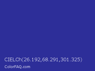 CIELCh 26.192,68.291,301.325 Color is a normal blue color and the nearest color is Blue Pigment #333399. Hex code #2d2e99 and RGB value is rgb(45,46,153). In RGB color space, this color is composed of 18% red, 18% green, 60% blue, In CMYK color space, this color is composed of 71% cyan, 70% magenta, 0% yellow , 40% black , In HSL color space, this color has a hue angle of 239° , 55% saturation and 39% lightness.