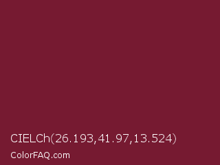 CIELCh 26.193,41.97,13.524 Color is a dark red color and the nearest color is Claret #7f1734. Hex code #761a31 and RGB value is rgb(118,26,49). In RGB color space, this color is composed of 46% red, 10% green, 19% blue, In CMYK color space, this color is composed of 0% cyan, 78% magenta, 58% yellow , 54% black , In HSL color space, this color has a hue angle of 345° , 64% saturation and 28% lightness.