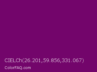 CIELCh 26.201,59.856,331.067 Color is a dark magenta color and the nearest color is Patriarch #800080. Hex code #73056b and RGB value is rgb(115,5,107). In RGB color space, this color is composed of 45% red, 2% green, 42% blue, In CMYK color space, this color is composed of 0% cyan, 96% magenta, 7% yellow , 55% black , In HSL color space, this color has a hue angle of 304° , 92% saturation and 24% lightness.