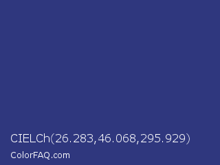 CIELCh 26.283,46.068,295.929 Color is a normal blue color and the nearest color is Bay Of Many #273a81. Hex code #2f377e and RGB value is rgb(47,55,126). In RGB color space, this color is composed of 18% red, 22% green, 49% blue, In CMYK color space, this color is composed of 63% cyan, 56% magenta, 0% yellow , 51% black , In HSL color space, this color has a hue angle of 234° , 46% saturation and 34% lightness.