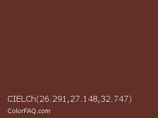 CIELCh 26.291,27.148,32.747 Color is a dark red color and the nearest color is Buccaneer #622f30. Hex code #632f29 and RGB value is rgb(99,47,41). In RGB color space, this color is composed of 39% red, 18% green, 16% blue, In CMYK color space, this color is composed of 0% cyan, 53% magenta, 59% yellow , 61% black , In HSL color space, this color has a hue angle of 6° , 41% saturation and 27% lightness.