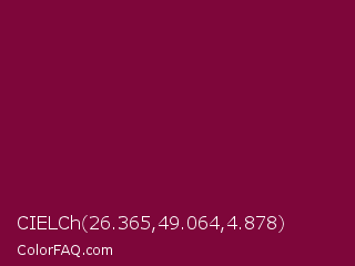 CIELCh 26.365,49.064,4.878 Color is a dark rose color and the nearest color is Siren #7a013a. Hex code #7e063a and RGB value is rgb(126,6,58). In RGB color space, this color is composed of 49% red, 2% green, 23% blue, In CMYK color space, this color is composed of 0% cyan, 95% magenta, 54% yellow , 51% black , In HSL color space, this color has a hue angle of 334° , 91% saturation and 26% lightness.