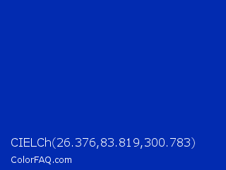 CIELCh 26.376,83.819,300.783 Color is a normal blue color and the nearest color is International Klein Blue #002fa7. Hex code #022bb0 and RGB value is rgb(2,43,176). In RGB color space, this color is composed of 1% red, 17% green, 69% blue, In CMYK color space, this color is composed of 99% cyan, 76% magenta, 0% yellow , 31% black , In HSL color space, this color has a hue angle of 226° , 98% saturation and 35% lightness.