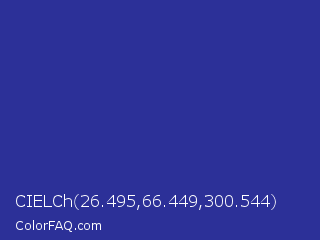 CIELCh 26.495,66.449,300.544 Color is a normal blue color and the nearest color is Blue Pigment #333399. Hex code #2c3098 and RGB value is rgb(44,48,152). In RGB color space, this color is composed of 17% red, 19% green, 60% blue, In CMYK color space, this color is composed of 71% cyan, 68% magenta, 0% yellow , 40% black , In HSL color space, this color has a hue angle of 238° , 55% saturation and 38% lightness.