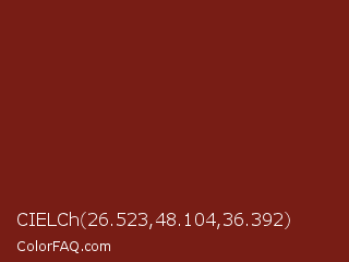 CIELCh 26.523,48.104,36.392 Color is a dark red color and the nearest color is Falu Red #801818. Hex code #781d15 and RGB value is rgb(120,29,21). In RGB color space, this color is composed of 47% red, 11% green, 8% blue, In CMYK color space, this color is composed of 0% cyan, 76% magenta, 83% yellow , 53% black , In HSL color space, this color has a hue angle of 5° , 70% saturation and 28% lightness.