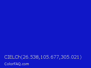 CIELCh 26.538,105.677,305.021 Color is a normal blue color and the nearest color is Dark Blue #0000c8. Hex code #0f17c9 and RGB value is rgb(15,23,201). In RGB color space, this color is composed of 6% red, 9% green, 79% blue, In CMYK color space, this color is composed of 93% cyan, 89% magenta, 0% yellow , 21% black , In HSL color space, this color has a hue angle of 237° , 86% saturation and 42% lightness.