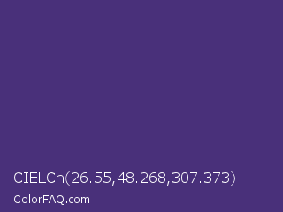 CIELCh 26.55,48.268,307.373 Color is a normal indigo color and the nearest color is Minsk #3f307f. Hex code #49307a and RGB value is rgb(73,48,122). In RGB color space, this color is composed of 29% red, 19% green, 48% blue, In CMYK color space, this color is composed of 40% cyan, 61% magenta, 0% yellow , 52% black , In HSL color space, this color has a hue angle of 260° , 44% saturation and 33% lightness.