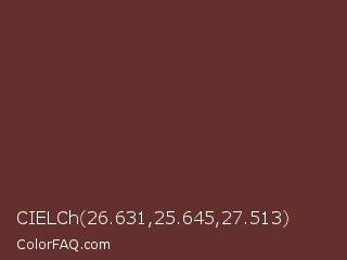 CIELCh 26.631,25.645,27.513 Color is a dark red color and the nearest color is Buccaneer #622f30. Hex code #63302e and RGB value is rgb(99,48,46). In RGB color space, this color is composed of 39% red, 19% green, 18% blue, In CMYK color space, this color is composed of 0% cyan, 52% magenta, 54% yellow , 61% black , In HSL color space, this color has a hue angle of 2° , 37% saturation and 28% lightness.