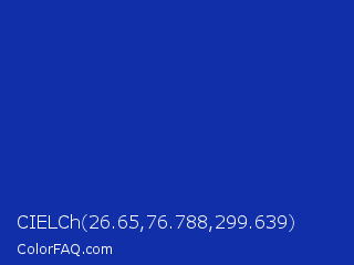 CIELCh 26.65,76.788,299.639 Color is a normal blue color and the nearest color is Egyptian Blue #1034a6. Hex code #102fa8 and RGB value is rgb(16,47,168). In RGB color space, this color is composed of 6% red, 18% green, 66% blue, In CMYK color space, this color is composed of 90% cyan, 72% magenta, 0% yellow , 34% black , In HSL color space, this color has a hue angle of 228° , 83% saturation and 36% lightness.