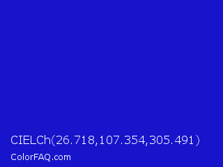 CIELCh 26.718,107.354,305.491 Color is a normal indigo color and the nearest color is Medium Blue #0000cd. Hex code #1714cb and RGB value is rgb(23,20,203). In RGB color space, this color is composed of 9% red, 8% green, 80% blue, In CMYK color space, this color is composed of 89% cyan, 90% magenta, 0% yellow , 20% black , In HSL color space, this color has a hue angle of 241° , 82% saturation and 44% lightness.