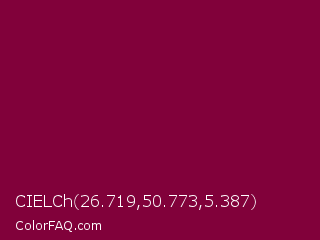 CIELCh 26.719,50.773,5.387 Color is a dark rose color and the nearest color is Siren #7a013a. Hex code #81013a and RGB value is rgb(129,1,58). In RGB color space, this color is composed of 51% red, 0% green, 23% blue, In CMYK color space, this color is composed of 0% cyan, 99% magenta, 55% yellow , 49% black , In HSL color space, this color has a hue angle of 333° , 98% saturation and 25% lightness.