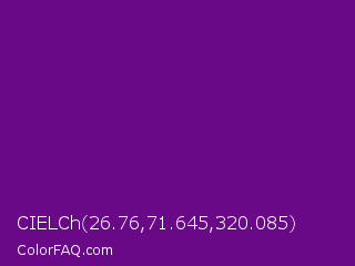 CIELCh 26.76,71.645,320.085 Color is a dark purple color and the nearest color is Purple #660099. Hex code #6a0987 and RGB value is rgb(106,9,135). In RGB color space, this color is composed of 42% red, 4% green, 53% blue, In CMYK color space, this color is composed of 21% cyan, 93% magenta, 0% yellow , 47% black , In HSL color space, this color has a hue angle of 286° , 88% saturation and 28% lightness.