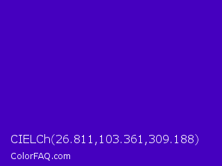 CIELCh 26.811,103.361,309.188 Color is a normal violet color and the nearest color is Interdimensional Blue #360ccc. Hex code #4500bf and RGB value is rgb(69,0,191). In RGB color space, this color is composed of 27% red, 0% green, 75% blue, In CMYK color space, this color is composed of 64% cyan, 100% magenta, 0% yellow , 25% black , In HSL color space, this color has a hue angle of 262° , 100% saturation and 37% lightness.