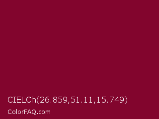 CIELCh 26.859,51.11,15.749 Color is a dark rose color and the nearest color is Paprika #8d0226. Hex code #82052d and RGB value is rgb(130,5,45). In RGB color space, this color is composed of 51% red, 2% green, 18% blue, In CMYK color space, this color is composed of 0% cyan, 96% magenta, 65% yellow , 49% black , In HSL color space, this color has a hue angle of 341° , 93% saturation and 26% lightness.