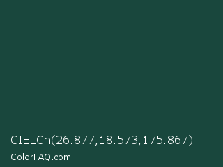 CIELCh 26.877,18.573,175.867 Color is a very dark cyan color and the nearest color is MSU Green #18453b. Hex code #19473d and RGB value is rgb(25,71,61). In RGB color space, this color is composed of 10% red, 28% green, 24% blue, In CMYK color space, this color is composed of 65% cyan, 0% magenta, 14% yellow , 72% black , In HSL color space, this color has a hue angle of 167° , 48% saturation and 19% lightness.