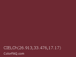 CIELCh 26.913,33.476,17.17 Color is a dark red color and the nearest color is Wine #722f37. Hex code #6e2832 and RGB value is rgb(110,40,50). In RGB color space, this color is composed of 43% red, 16% green, 20% blue, In CMYK color space, this color is composed of 0% cyan, 64% magenta, 55% yellow , 57% black , In HSL color space, this color has a hue angle of 351° , 47% saturation and 29% lightness.