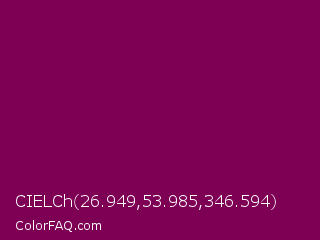 CIELCh 26.949,53.985,346.594 Color is a dark magenta color and the nearest color is Rose Bud Cherry #800b47. Hex code #7e0054 and RGB value is rgb(126,0,84). In RGB color space, this color is composed of 49% red, 0% green, 33% blue, In CMYK color space, this color is composed of 0% cyan, 100% magenta, 33% yellow , 51% black , In HSL color space, this color has a hue angle of 320° , 100% saturation and 25% lightness.