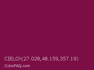 CIELCh 27.028,48.159,357.19 Color is a dark rose color and the nearest color is Rose Bud Cherry #800b47. Hex code #7d0e45 and RGB value is rgb(125,14,69). In RGB color space, this color is composed of 49% red, 5% green, 27% blue, In CMYK color space, this color is composed of 0% cyan, 89% magenta, 45% yellow , 51% black , In HSL color space, this color has a hue angle of 330° , 80% saturation and 27% lightness.