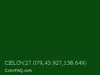 CIELCh 27.079,43.927,138.649 Color is a very dark green color and the nearest color is Dark Fern #0a480d. Hex code #094b0e and RGB value is rgb(9,75,14). In RGB color space, this color is composed of 4% red, 29% green, 5% blue, In CMYK color space, this color is composed of 88% cyan, 0% magenta, 81% yellow , 71% black , In HSL color space, this color has a hue angle of 125° , 79% saturation and 16% lightness.