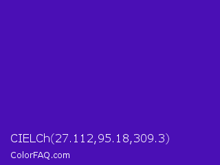 CIELCh 27.112,95.18,309.3 Color is a normal violet color and the nearest color is Interdimensional Blue #360ccc. Hex code #4a0fb5 and RGB value is rgb(74,15,181). In RGB color space, this color is composed of 29% red, 6% green, 71% blue, In CMYK color space, this color is composed of 59% cyan, 92% magenta, 0% yellow , 29% black , In HSL color space, this color has a hue angle of 261° , 85% saturation and 38% lightness.