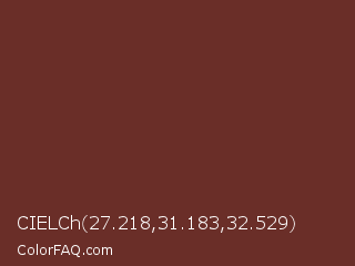 CIELCh 27.218,31.183,32.529 Color is a dark red color and the nearest color is Liver Organ #6c2e1f. Hex code #6a2e28 and RGB value is rgb(106,46,40). In RGB color space, this color is composed of 42% red, 18% green, 16% blue, In CMYK color space, this color is composed of 0% cyan, 57% magenta, 62% yellow , 58% black , In HSL color space, this color has a hue angle of 5° , 45% saturation and 29% lightness.