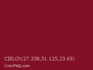 CIELCh 27.338,51.125,23.69 Color is a dark red color and the nearest color is Merlot #831923. Hex code #820f24 and RGB value is rgb(130,15,36). In RGB color space, this color is composed of 51% red, 6% green, 14% blue, In CMYK color space, this color is composed of 0% cyan, 88% magenta, 72% yellow , 49% black , In HSL color space, this color has a hue angle of 349° , 79% saturation and 28% lightness.