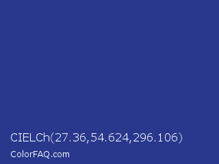 CIELCh 27.36,54.624,296.106 Color is a normal blue color and the nearest color is Bay Of Many #273a81. Hex code #29388d and RGB value is rgb(41,56,141). In RGB color space, this color is composed of 16% red, 22% green, 55% blue, In CMYK color space, this color is composed of 71% cyan, 60% magenta, 0% yellow , 45% black , In HSL color space, this color has a hue angle of 231° , 55% saturation and 36% lightness.