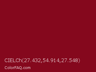 CIELCh 27.432,54.914,27.548 Color is a dark red color and the nearest color is Monarch #8b0723. Hex code #85081d and RGB value is rgb(133,8,29). In RGB color space, this color is composed of 52% red, 3% green, 11% blue, In CMYK color space, this color is composed of 0% cyan, 94% magenta, 78% yellow , 48% black , In HSL color space, this color has a hue angle of 350° , 89% saturation and 28% lightness.