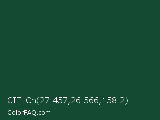 CIELCh 27.457,26.566,158.2 Color is a very dark green color and the nearest color is MSU Green #18453b. Hex code #134a31 and RGB value is rgb(19,74,49). In RGB color space, this color is composed of 7% red, 29% green, 19% blue, In CMYK color space, this color is composed of 74% cyan, 0% magenta, 34% yellow , 71% black , In HSL color space, this color has a hue angle of 153° , 59% saturation and 18% lightness.