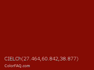CIELCh 27.464,60.842,38.877 Color is a dark red color and the nearest color is Barn Red #7c0a02. Hex code #850c05 and RGB value is rgb(133,12,5). In RGB color space, this color is composed of 52% red, 5% green, 2% blue, In CMYK color space, this color is composed of 0% cyan, 91% magenta, 96% yellow , 48% black , In HSL color space, this color has a hue angle of 3° , 93% saturation and 27% lightness.
