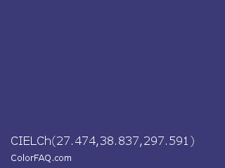 CIELCh 27.474,38.837,297.591 Color is a normal indigo color and the nearest color is Minsk #3f307f. Hex code #3b3a76 and RGB value is rgb(59,58,118). In RGB color space, this color is composed of 23% red, 23% green, 46% blue, In CMYK color space, this color is composed of 50% cyan, 51% magenta, 0% yellow , 54% black , In HSL color space, this color has a hue angle of 241° , 34% saturation and 35% lightness.