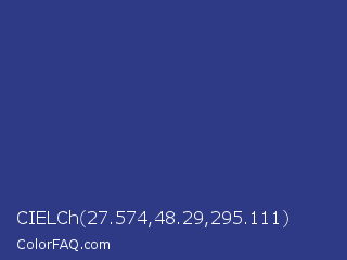 CIELCh 27.574,48.29,295.111 Color is a normal blue color and the nearest color is Bay Of Many #273a81. Hex code #2e3a85 and RGB value is rgb(46,58,133). In RGB color space, this color is composed of 18% red, 23% green, 52% blue, In CMYK color space, this color is composed of 65% cyan, 56% magenta, 0% yellow , 48% black , In HSL color space, this color has a hue angle of 232° , 49% saturation and 35% lightness.