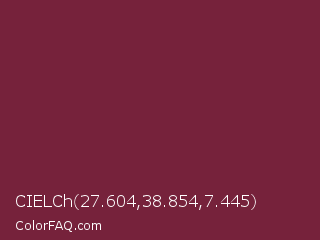 CIELCh 27.604,38.854,7.445 Color is a dark rose color and the nearest color is Wine #722f37. Hex code #76223b and RGB value is rgb(118,34,59). In RGB color space, this color is composed of 46% red, 13% green, 23% blue, In CMYK color space, this color is composed of 0% cyan, 71% magenta, 50% yellow , 54% black , In HSL color space, this color has a hue angle of 342° , 55% saturation and 30% lightness.