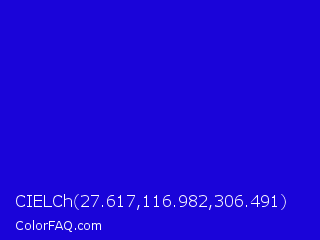 CIELCh 27.617,116.982,306.491 Color is a normal indigo color and the nearest color is Medium Blue #0000cd. Hex code #1a04d9 and RGB value is rgb(26,4,217). In RGB color space, this color is composed of 10% red, 2% green, 85% blue, In CMYK color space, this color is composed of 88% cyan, 98% magenta, 0% yellow , 15% black , In HSL color space, this color has a hue angle of 246° , 96% saturation and 43% lightness.