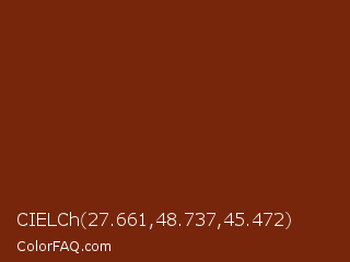 CIELCh 27.661,48.737,45.472 Color is a dark color and the nearest color is Pueblo #7d2c14. Hex code #77260b and RGB value is rgb(119,38,11). In RGB color space, this color is composed of 47% red, 15% green, 4% blue, In CMYK color space, this color is composed of 0% cyan, 68% magenta, 91% yellow , 53% black , In HSL color space, this color has a hue angle of 15° , 83% saturation and 25% lightness.