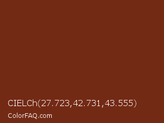 CIELCh 27.723,42.731,43.555 Color is a dark red color and the nearest color is Mocha #782d19. Hex code #732a15 and RGB value is rgb(115,42,21). In RGB color space, this color is composed of 45% red, 16% green, 8% blue, In CMYK color space, this color is composed of 0% cyan, 63% magenta, 82% yellow , 55% black , In HSL color space, this color has a hue angle of 13° , 69% saturation and 27% lightness.