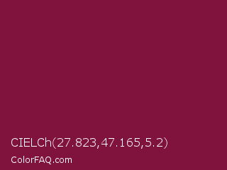 CIELCh 27.823,47.165,5.2 Color is a dark rose color and the nearest color is Claret #7f1734. Hex code #80133d and RGB value is rgb(128,19,61). In RGB color space, this color is composed of 50% red, 7% green, 24% blue, In CMYK color space, this color is composed of 0% cyan, 85% magenta, 52% yellow , 50% black , In HSL color space, this color has a hue angle of 337° , 74% saturation and 29% lightness.