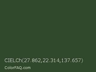 CIELCh 27.862,22.314,137.657 Color is a very dark green color and the nearest color is Kombu Green #354230. Hex code #2f482a and RGB value is rgb(47,72,42). In RGB color space, this color is composed of 18% red, 28% green, 16% blue, In CMYK color space, this color is composed of 35% cyan, 0% magenta, 42% yellow , 72% black , In HSL color space, this color has a hue angle of 110° , 26% saturation and 22% lightness.