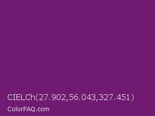 CIELCh 27.902,56.043,327.451 Color is a dark magenta color and the nearest color is Midnight #702670. Hex code #701b71 and RGB value is rgb(112,27,113). In RGB color space, this color is composed of 44% red, 11% green, 44% blue, In CMYK color space, this color is composed of 1% cyan, 76% magenta, 0% yellow , 56% black , In HSL color space, this color has a hue angle of 299° , 61% saturation and 27% lightness.