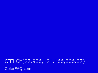 CIELCh 27.936,121.166,306.37 Color is a normal indigo color and the nearest color is Medium Blue #0000cd. Hex code #0800e0 and RGB value is rgb(8,0,224). In RGB color space, this color is composed of 3% red, 0% green, 88% blue, In CMYK color space, this color is composed of 96% cyan, 100% magenta, 0% yellow , 12% black , In HSL color space, this color has a hue angle of 242° , 100% saturation and 44% lightness.