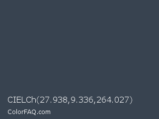 CIELCh 27.938,9.336,264.027 Color is a dark blue color and the nearest color is Charcoal #36454f. Hex code #384350 and RGB value is rgb(56,67,80). In RGB color space, this color is composed of 22% red, 26% green, 31% blue, In CMYK color space, this color is composed of 30% cyan, 16% magenta, 0% yellow , 69% black , In HSL color space, this color has a hue angle of 213° , 18% saturation and 27% lightness.