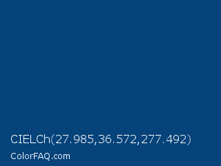 CIELCh 27.985,36.572,277.492 Color is a dark blue color and the nearest color is Dark Cerulean #08457e. Hex code #05437a and RGB value is rgb(5,67,122). In RGB color space, this color is composed of 2% red, 26% green, 48% blue, In CMYK color space, this color is composed of 96% cyan, 45% magenta, 0% yellow , 52% black , In HSL color space, this color has a hue angle of 208° , 92% saturation and 25% lightness.