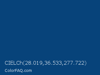 CIELCh 28.019,36.533,277.722 Color is a dark blue color and the nearest color is Dark Cerulean #08457e. Hex code #07437a and RGB value is rgb(7,67,122). In RGB color space, this color is composed of 3% red, 26% green, 48% blue, In CMYK color space, this color is composed of 94% cyan, 45% magenta, 0% yellow , 52% black , In HSL color space, this color has a hue angle of 209° , 89% saturation and 25% lightness.